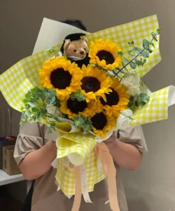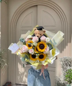 Hình ảnh gấu bông đội mũ tốt nghiệp luôn được yêu thích và sử dụng khi tặng bó hoa tốt nghiệp ý nghĩa, đặc biệt là sự kết hợp hoa hướng dương và gấu bông tốt nghiệp như lời cổ vũ dành cho sinh viên tốt nghiệp lời chúc ý nghĩa nhất.