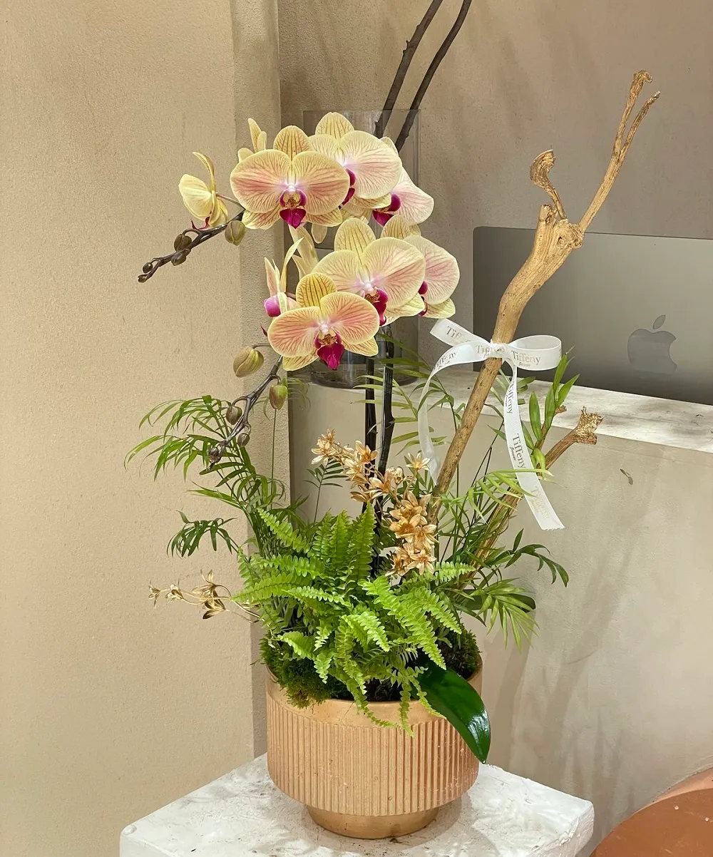 Từng chậu hoa đều được phối hợp tinh tế giữa cành hồ điệp nhập khẩu, chậu sứ men cao cấp cùng phụ kiện trang trí đặc trưng ngày xuân, mang đến sự trọn vẹn và may mắn cho năm mới.