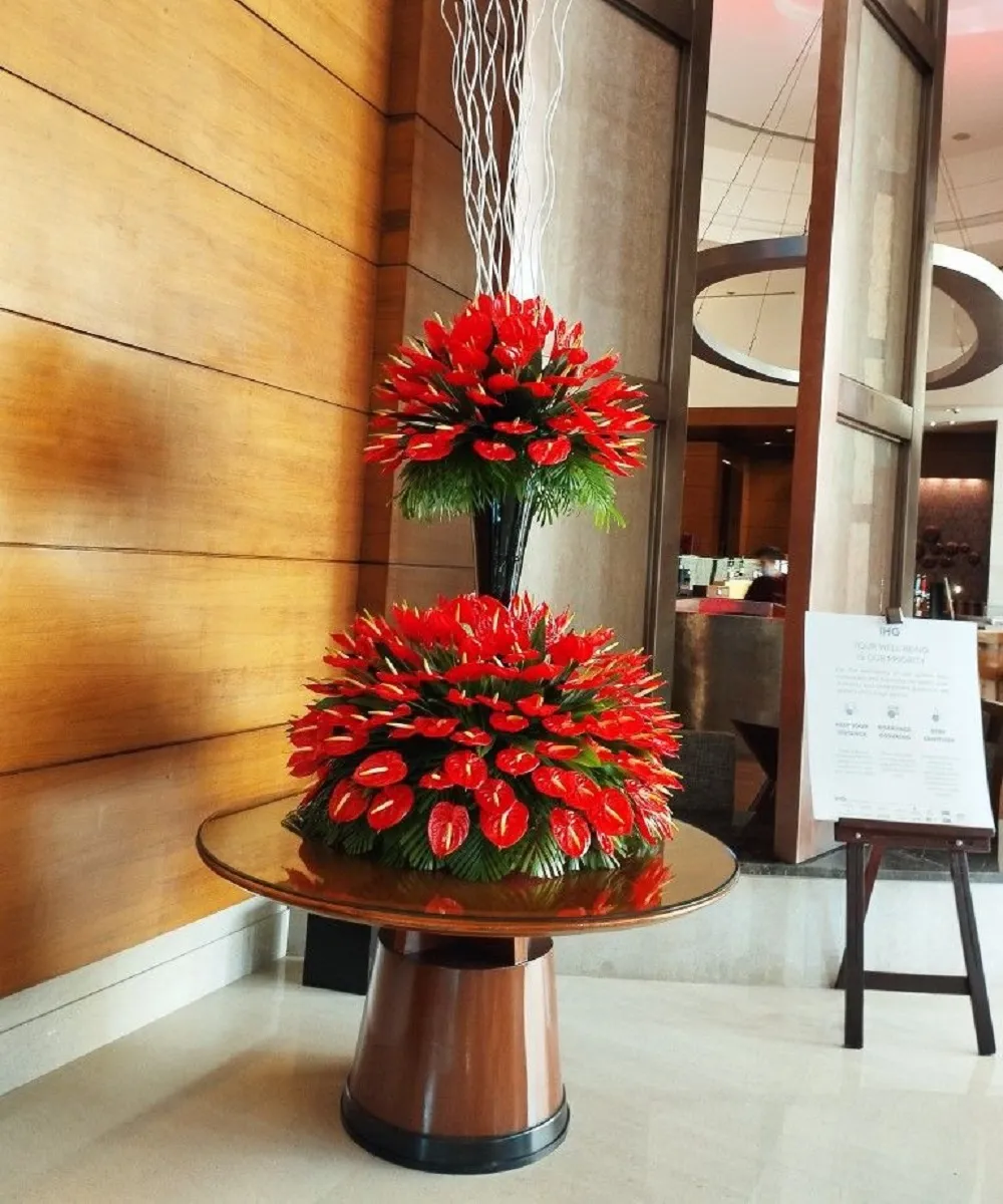 - Kích thước: Phối hợp tỷ lệ hoa với diện tích bàn lễ tân. Không gian nhỏ nên chọn bình hoa gọn gàng, trong khi bàn lớn có thể trưng bày thiết kế hoành tráng hơn.