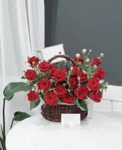 Lẵng hoa được thiết kế với sự tinh tế và sáng tạo, từng bông hoa hồng như những viên ngọc quý trải đều trên kệ hoa.