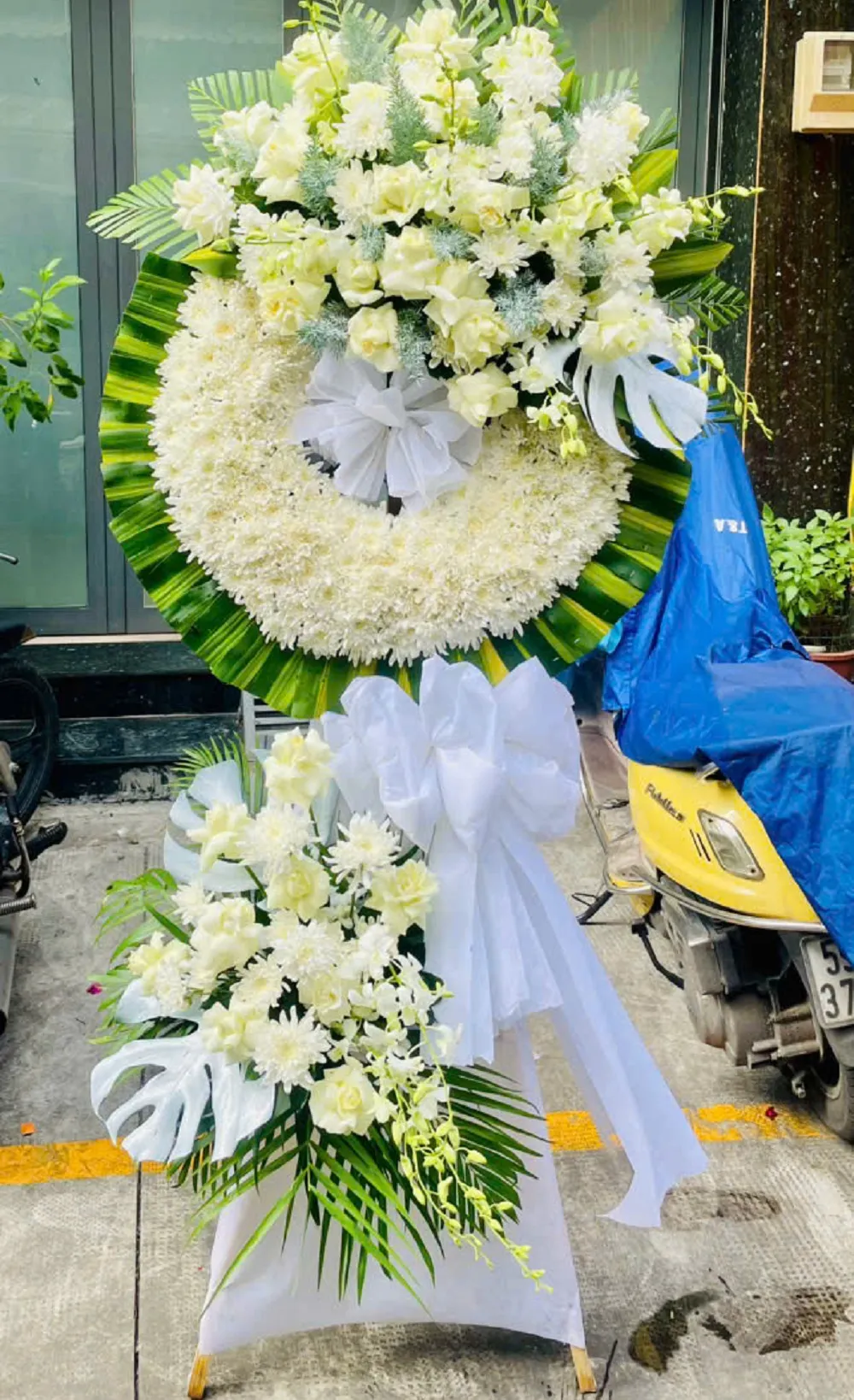 So với vòng hoa đơn tầng, hoa đám tang 2 tầng có kích thước lớn hơn, được kết hợp từ nhiều loại hoa như lan hồ điệp, hoa cúc trắng, hoa hồng trắng hoặc hoa ly, mang thông điệp chia buồn sâu lắng và tôn vinh cuộc đời người đã ra đi.